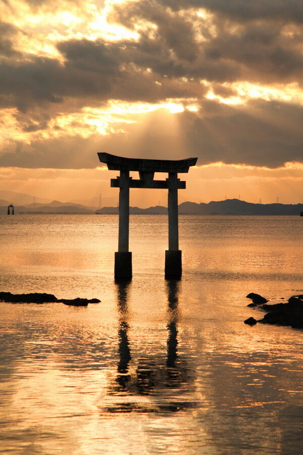 潮の時間や夕日の時間帯などによっていろんな表情が見られる海上鳥居