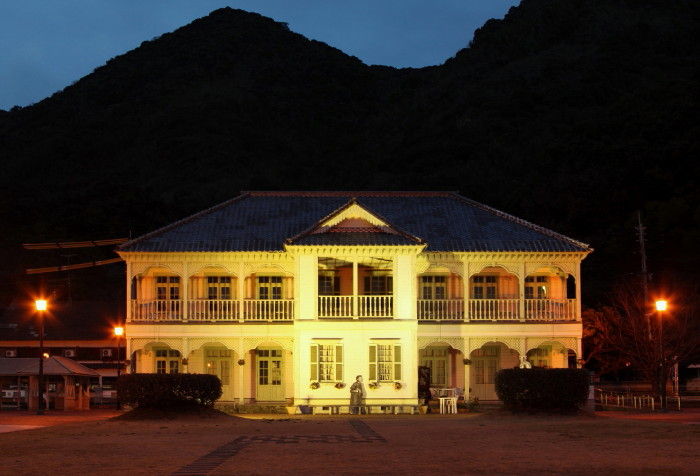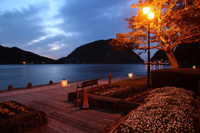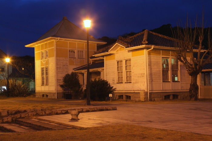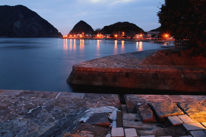 2016年05月05日 夜の三角西港 明治日本の産業革命遺産のひとつとして、昨年世界文化遺産にも認定された熊本県宇城市の三角西港です。今回は日が暮れ始めた夕暮れ時に訪れてみました。石積の埠頭が徐々に夜の色に変わってきました。ライトに照らされた「浦島屋」もくっきりと浮かび上がっています。向こうに見えるのは工事中の天草幹線道路新天門橋(仮称)です。こちらは「龍驤館」昼間は釣り人や観光客が多いこの周辺も夜は静かです。しばらくこのベンチに座って海を眺めていました。昼間とはまたちょっと雰囲気の違った三角西港でした。 タグ :#熊本県