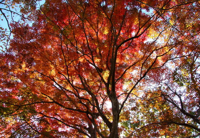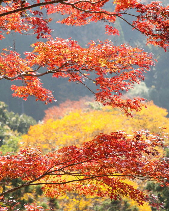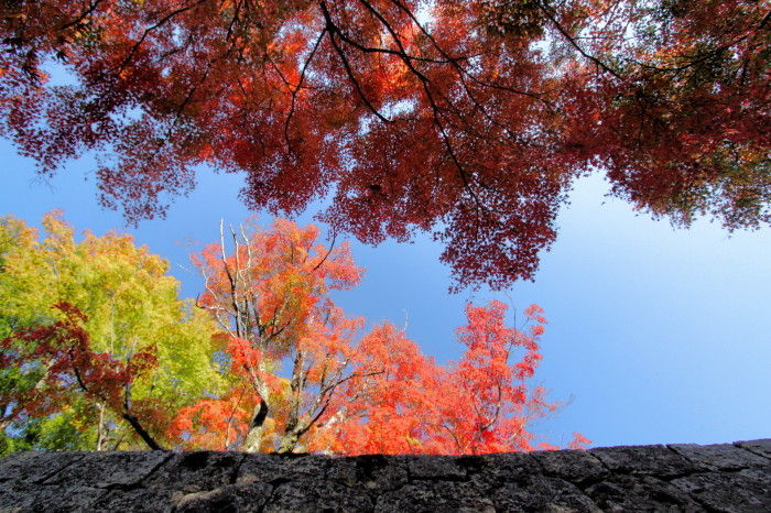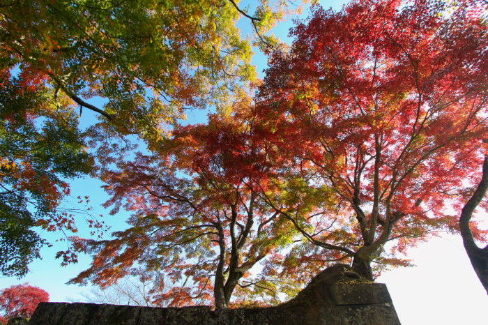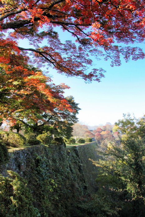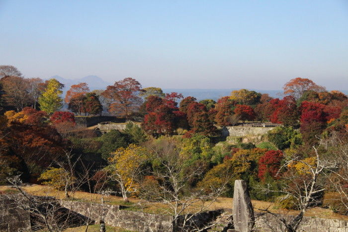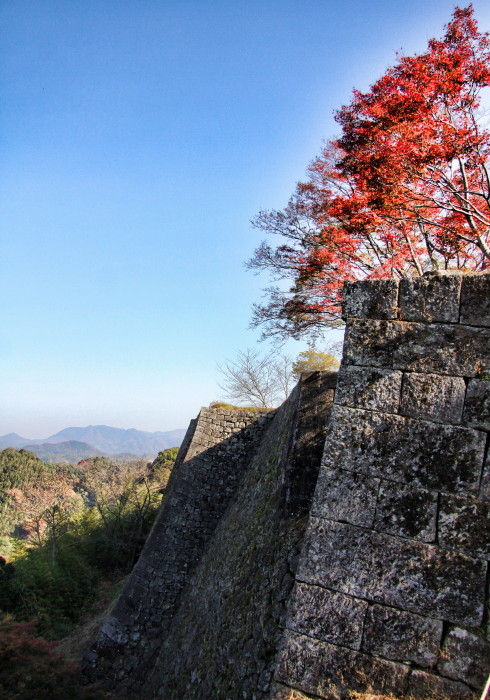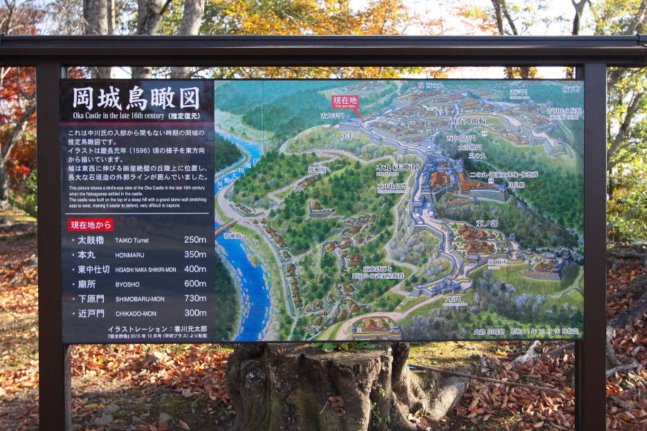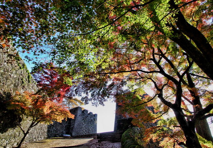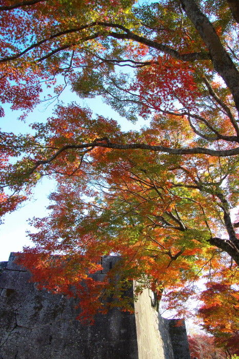 2018年11月14日 岡城跡の紅葉 うららかな小春日和の一日、大分県竹田市の岡城跡へと行ってみました。岡城跡は昭和11年に国指定史跡に認定されています。大手門への石段を登っていくと木々が鮮やかに色づいていました。鳥瞰図慶長元年 (1596年)頃の様子を描いたものらしいですがこれを見るといかに岡城が広大なお城だったのかという事をうかがい知ることができます。見上げると青空に鮮やかな紅葉が 太鼓櫓跡付近です緑と朱と赤の葉が織りなす色の競演に深まりゆく秋を感じます。岡城跡はその城郭の美しさからトリップアドバイザーによる2018年度の旅好きが選ぶ ! 日本の城ランキング城郭部門第1位(総合5位)に選ばれています。竹田市ゆかりの作曲家瀧廉太郎像近くを通る国道502号線のメロディロードから車が通るたびに名曲「荒城の月」が流れどこか旅情を誘います。 巻物型の案内図と登城手形 タグ :#大分県